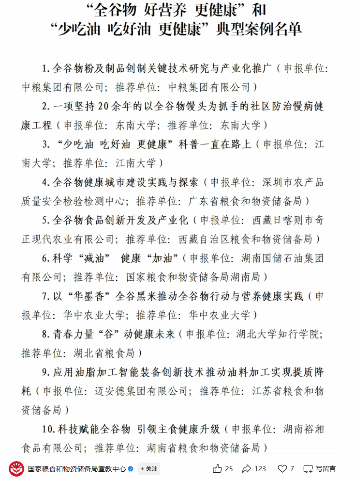 为深入贯彻党的二十大和二十届二中、三中全会精神,认真落实健康中国战略和《粮食节约和反食品浪费行动方案》,营造全谷物和油脂科学合理消费、促进健康生活、助力节粮减损的浓厚社会氛围,2025年4月,国家粮食和物资储备局面向地方粮食和物资储备部门、涉粮央企、高校、各垂直管理局及有关单位组织开展案例征集工作。经各单位严格审核推荐,国家粮食和物资储备局宣传教育中心认真组织评审,确定了10个“全谷物 好营养 更健康”和“少吃油 吃好油 更健康”典型案例,我校申报的《青春力量“谷”动健康未来》案例入选。《通知》要求,各地粮食和物资储备部门及有关单位要紧密结合本地区本单位实际,学习典型案例中推动科技创新、产业提升、标准体系建设、品牌培育和科普宣传等方面的好经验好做法,持续深入做好促进粮食节约、全谷物和油脂科学健康消费等各项工作。案例入选单位要再接再厉,持续发挥好引领作用,为推动粮食和物资储备事业高质量发展贡献新力量。